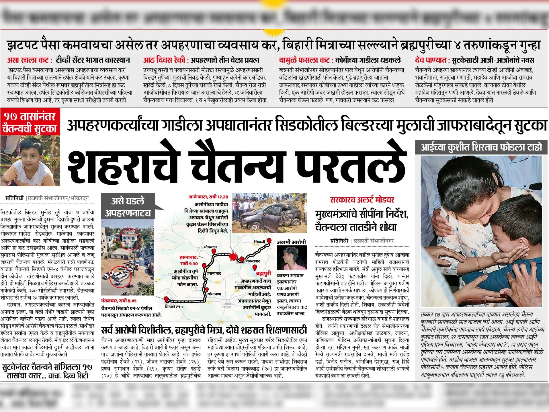 सिडको बिल्डर सुनील तुपे या 3 वर्षांचा मुलगा, चैतन्यच्या दुसर्या दिवशी जालना जिल्ह्यातील जाफरबाद येथून सुटका करण्यात आला. भोकर्दन-महोरा रोडवरील मालेगाव गेटवर किडनपरच्या कारला कोबीच्या कारने धडक दिली आणि षडयंत्र उघडकीस आले. संध्याकाळी